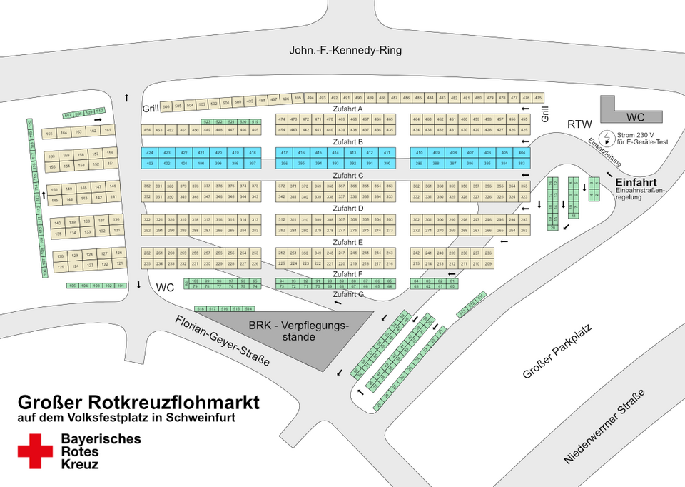 Die Bewirtung übernimmt das Rote Kreuz selbst. Kostenlose Parkplätze stehen im Umfeld des Volksfestplatzes zur Verfügung. Das BRK bittet allerdings, nicht den Kundenparkplatz am E-Center (John-F.-Kennedy-Ring/Oskar-von-Miller-Straße) zu benutzen.