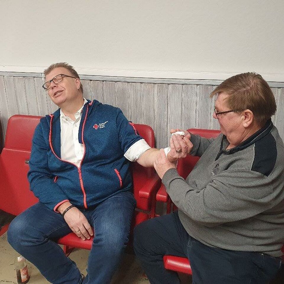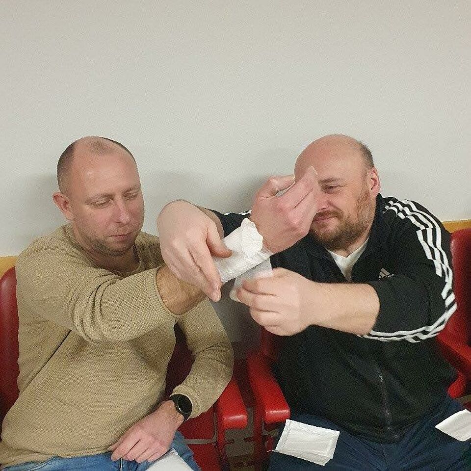 Auch typische Sportverletzungen wie Schürfwunden, Nasenbluten, Prellung, Verstauchung und Knochenbrüche wurden thematisiert. Mit den geübten Verbänden wurde auch die Wundversorgung, auf bei lebensbedrohlichen Blutungen, durchgeführt.