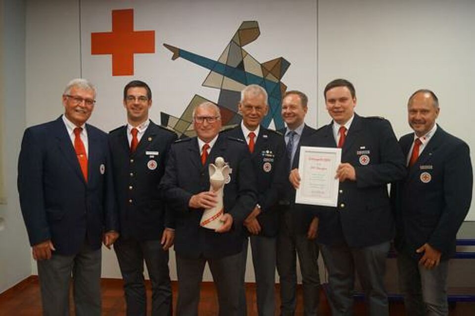 Als ihr Freund, Gerald Effertz, seine Würdigung erhalten hatte, ging Sabine Besler ans Rednerpult. Im Gepäck hatte sie eine emotionale Würdigung des Ehrenamts. Sie machte deutlich, wie wichtig es ist, ehrenamtliche Helfer zu haben. "Menschen, die ihr Amt mit viel Liebe, Leidenschaft und Engagement ausüben" so Besler. Solche Personen "verdienen Respekt, viel Lob und Anerkennung" stellte sie fest. Und auch wenn "es nicht immer leicht ist, als Familie auch mal zurückstecken zu müssen" sagte sie, trotzdem "steht die Familie immer hinter ihren BRK-Helfern". Sie wünschte ihrem Freund aber auch allen anderen Ehrenamtlichen "stets einen Schutzengel an der Seite". Passend dazu hatte sie einen Schutzengel aus Porzellan, gesegnet von Diakon Günter Schöneich, dabei. Sie stiftete ihm dem Kreisverband. Er wird einen schönen Platz bekommen versicherten die Verantwortlichen. Aus den Händen von Hartmut Bräuer erhielt dann Paul Nußbaum für fünf Jahrzehnte Unterstützung die DRK-Ehrennadel. Friedel Tellert "eine ganz besondere Persönlichkeit im BRK" so Bräuer wurde ebenfalls mit dieser Auszeichnung geehrt. Unter anderem für sein Engagement, im Altlandkreis Gerolzhofen. "Du hast die Menschen des BRK die dort waren, zusammengehalten" so Bräuer. Auch Kreisbereitschaftsleiter Jürgen Niklaus dankte Tellert für das zur Seite stehen "mit Rat und Tat".Und dann kam auch Hartmut Bräuer "unerwartet aber nicht unverdient" wie Dr. Weiß es ausdrückte in den Genuss einer Auszeichnung. Der "würdige Repräsentant des Kreisverbandes Schweinfurt" machte Weiß deutlich, erhielt die silberne Ehrennadel des BRK unter anderem für seine lange Zeit in der Vorstandschaft des Kreisverbandes. Die Verleihung der Ehrenzeichen der Bereitschafen in Silber oblag dem stellvertretenden Bezirksbereitschaftsleiter, Alexander Kretz. Jochen Dorsch (unter anderem gehört er zur Stammmannschaft der SEG Behandlung als Maschinist und Fahrer, stellt aber auch gern sein handwerkliches Geschick zur Verfügung) und Jan Dressler (IT-Spezialist im Kreisverband, treuer Mitstreiter in der UG-SanEL, Ausbilder in Erster Hilfe und vieles mehr) wurden für ihr großes Engagement ausgezeichnet.Sechs Jahrzehnte im BRK aktiv