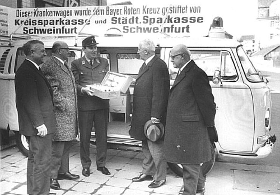 Bis zum Jahre 1975, bevor der Rettungsdienst in Bayern durch Gesetz geregelt wurde, mussten die erforderlichen Fahrzeuge für den Krankentransport selbst angeschafft werden. Hierbei haben die Kreissparkasse und die Stadtsparkasse das Rote Kreuz in Schweinfurt maßgeblich unterstützt.