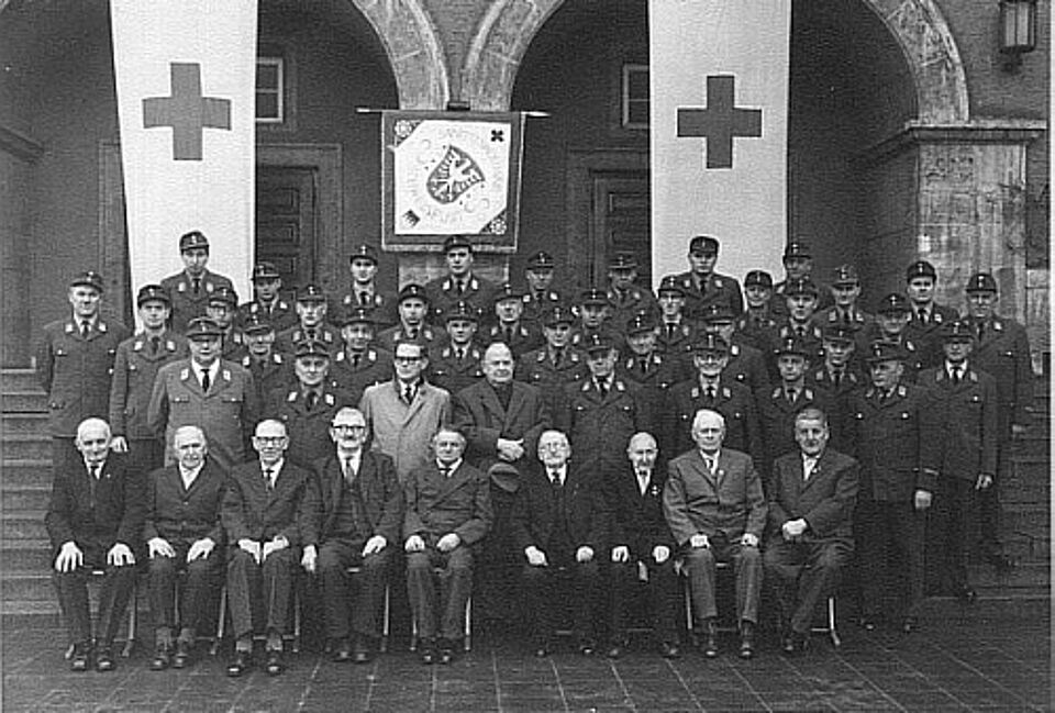 Im Jahre 1964 feiert die Sanitätskolonne Schweinfurt ihr 75- jähriges Bestehen. Höhepunkt ist die Segnung der Rotkreuzfahne, die auch heute noch zu ferierlichen Anlässen und bei Beerdigungen von Bereitschaftsmitgliedern zum Einsatz kommt.
