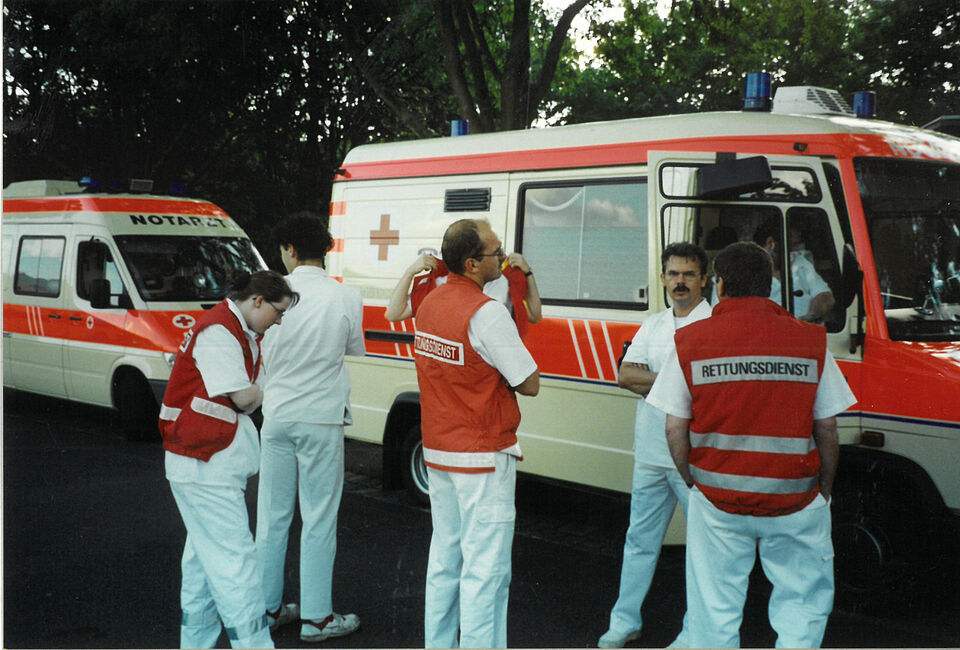 4 hauptamtliche Sanitäter als Besatzung für zwei Krankenwagen von 6.00 Uhr bis 18.00 Uhr.