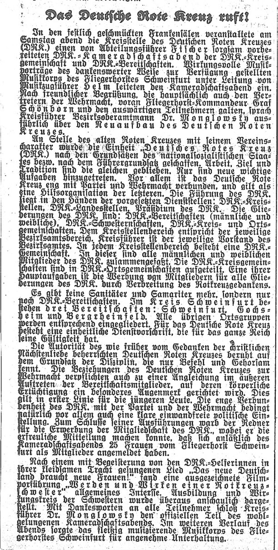 1960 wurden 23 Helfer und 12 Helferinnen vom Schweinfurter Kreisverband nach München zum Eucharistischen Weltkongress entsandt, wo 3000 Sanitätskräfte 1,2 Millionen Besucher betreuten. Bei den Deutschen Turnspielmeisterschaften 1961 im Willy-Sachs-Stadion waren 44 Helfer bzw. Helferinnen zum Sanitätsdienst eingeteilt.